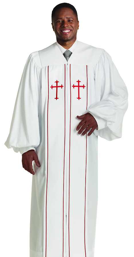 This clergy robe is ideal for summer and special occasion use. It is tailored in wrinkle-resistant white Wonder Crepe, accented with scarlet red corded piping and Latin Crosses, with deep front pleats, featuring lined belled sleeves with deep cuffs. Generously cut body with balanced machine fluting over shoulders and across back and right pocket slit.