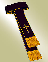 This band cincture features black Viva fabric with gold piping, fringe, and a Latin Cross on the top drop. Fastens with an adjustable Velcro closure. Available in even sizes from 34" to 52". Designed to be worn with Murphy's H-108 Cassock (sold separately).