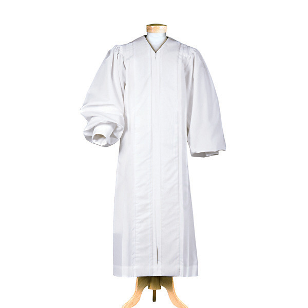 Our most popular Abbott Hall robe! Made of white Liberty fabric and features matching white Velveteen panels with outside pleating for a more refined look. Zipper closure. The sleeves are double lined with cuffs for a bell effect while fluting across the shoulders and back provide a beautiful drape. Sized for women.