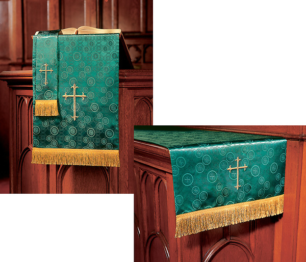 Available in Vermilion (Red), Emerald, Majestic Purple, or White Millenova brocade, each set consist of a Bible marker, pulpit scarf, and a communion table runner. Embellished with antique gold fringe and embroidered gold metallic Latin Crosses. Satin lined and interlined for lasting shape retention.