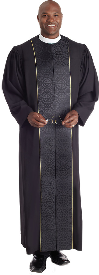 Tailored in black Wonder Crepe and designed to wear over a tab collar or neckband collar clergy shirt. Damascene brocade front panels accented by bright gold metallic piping. Fully lined with coat style sleeves and a right pocket slit (for mic wires). Sized for a floor clearance of 6 to 8 inches.