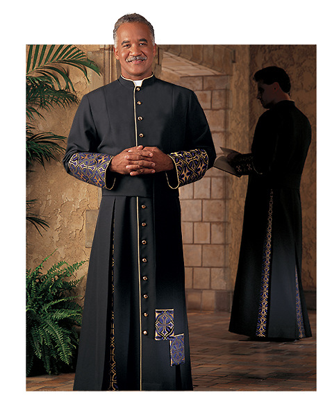 This unique robe features white Wonder Crepe fabric with closed black velvet panels and black shoulder braids. Also features a right pocket slit (for mic wires) and lined bell sleeves. Belt cincture sold separately.