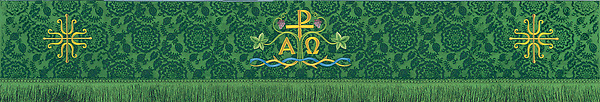The Castle Craft Series 361/947 superfrontal is all embroidered (no applique) featuring a green fringe at the bottom and a pole pocket for fastening the piece to furniture. Fabric at top of table is made of off-white linen. Made in the USA.