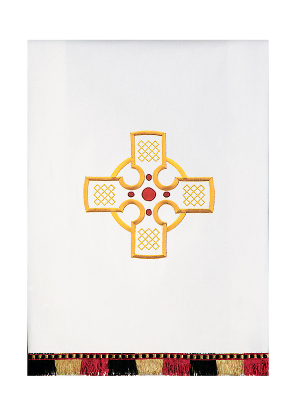 The Castle Craft 1314 Celtic Cross Pulpit Scarf is all embroidered (no applique) featuring a variegated fringe at the bottom and a pole pocket for fastening the piece to furniture. Fabric at top of table will be of the same fabric as the drop portion with the exception of Angus Dei, Davinci Brocade, Ely, Normandy,Tudor Rose, Premium Angus Dei and Premium Tudor Rose. The standard table top fabric for these is made of white linen. Made in the USA. This Pulpit Scarf can be purchased in many different fabrics and patterns. See the fabric guide on the "Content" tab to determine what material each fabric/pattern is made of. Choose the fabric/pattern from the drop down menu above to determine pricing. Comes in standard size - 20" width (left to right) x 20" depth (top front to back) x 20" drop (area hanging in front). May be ordered in custom sizes. Please call our custom sales team at 1-800-237-7511 for additional help. **This product is custom made to order and therefore non-returnable. Please allow up to eight weeks for delivery**