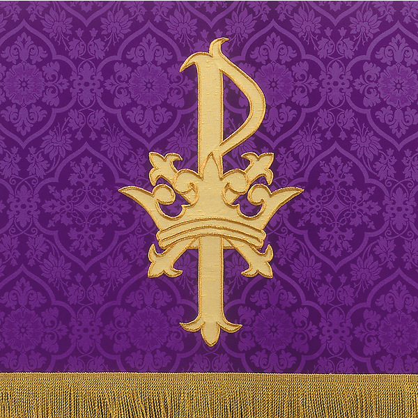 The T30 Reconcile Us Oh Lord lectern scarf is an applique with satin stitch embroidery featuring fringe at the bottom and a pole pocket for fastening the piece to furniture. Fabric at top of table will be of the same fabric as the drop portion with the exception of Agnus Dei, Davinci Brocade, Normandy Brocade, Tudor Rose and Premium Normandy Brocade. The standard table top fabric for these is made of white linen. Made in the USA. This lectern scarf can be purchased in many different fabrics and patterns. See the fabric on the "Content" tab below to determine what material each fabric/pattern is made of. Choose the fabric/pattern from the drop down menu above to determine pricing. Comes in standard size - 20" width (left to right) x 20" depth (top front to back) x 20" drop (area hanging in front). May be ordered in custom sizes. Please call our custom sales team at 1-800-237-7511 for additional help. **This product is custom made to order and therefore non-returnable. Please allow up to eight weeks for delivery**