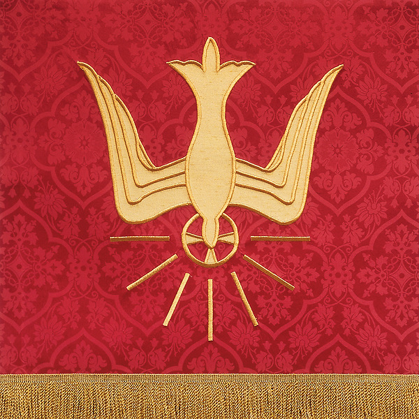 The T10 Come Holy Spirit lectern scarf is an applique with satin stitch embroidery featuring fringe at the bottom and a pole pocket for fastening the piece to furniture. Fabric at top of table will be of the same fabric as the drop portion with the exception of Davinci Brocade, Ely Brocade, Normandy Brocade, and Tudor Rose. The standard table top fabric for these is made of white linen. Made in the USA This lectern scarf can be purchased in many different fabrics and patterns. See the fabric on the "Content" tab below to determine what material each fabric/pattern is made of. Choose the fabric/pattern from the drop down menu above to determine pricing. Comes in standard size - 20" width (left to right) x 20" depth (top front to back) x 20" drop (area hanging in front). May be ordered in custom sizes. Please call our custom sales team at 1-800-237-7511 for additional help. **This product is custom made to order and therefore non-returnable. Please allow up to eight weeks for delivery**