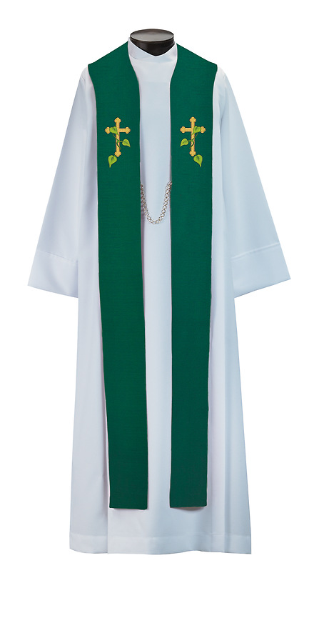 The 1993 I Am The Vine Stole is an applique with satin-stitch embroidery featuring a standard style with tapered neckline. Made in the USA. This stole can be purchased in many different fabrics and patterns. See the fabric guide on the "Content" tab to determine what material each fabric/pattern is made of. Choose the fabric/pattern from the drop down menu above to determine pricing. Comes in 2 standard sizes -100" or 112" length. May be ordered in custom sizes. Please call our custom sales team at 1-800-237-7511 for additional help. **This piece is custom made and is therefore non-returnable. Please allow up to eight weeks for delivery**