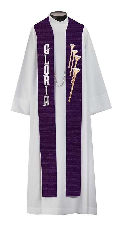 The 7000 Annunciation Stole is applique with satin-stitch embroidery featuring a standard style with tapered neckline. Made in the USA. This stole can be purchased in many different fabrics and patterns. See the fabric guide on the "Content" tab to determine what material each fabric/pattern is made of. Choose the fabric/pattern from the drop down menu above to determine pricing. Comes in 2 standard sizes -100" or 112" length. May be ordered in custom sizes. Please call our custom sales team at 1-800-237-7511 for additional help. **This piece is custom made and is therefore non-returnable. Please allow up to eight weeks for delivery**