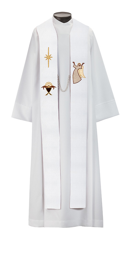 The 1886 Rejoice Manger Stole is an applique with satin-stitch embroidery featuring a standard style with tapered neckline. Made in the USA. This stole can be purchased in many different fabrics and patterns. See the fabric guide on the "Content" tab to determine what material each fabric/pattern is made of. Choose the fabric/pattern from the drop down menu above to determine pricing. Comes in 2 standard sizes -100" or 112" length. May be ordered in custom sizes. Please call our custom sales team at 1-800-237-7511 for additional help. **This piece is custom made and is therefore non-returnable. Please allow up to eight weeks for delivery**