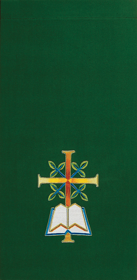 TheCastle Craft 39/1303 Pulpit Scarf is all embroidered (no applique) featuring a fringe at the bottom and a pole pocket for fastening the piece to furniture. Fabric at top of table will be of the same fabric as the drop portion with the exception of Normandy Brocade, Tudor Rose and Premium Tudor Rose. The standard table top fabric for these is made of white linen. Made in the USA. This pulpit scarf can be purchased in many different fabrics and patterns. See the fabric guide on the "Content" tab to determine what material each fabric/pattern is made of. Choose the fabric/pattern from the drop down menu above to determine pricing. Comes in standard size - 20" width (left to right) x 20" depth (top front to back) x 20" drop (area hanging in front). May be ordered in custom sizes. Please call our custom sales team at 1-800-237-7511 for additional help. **This product is custom made to order and therefore non-returnable. Please allow up to eight weeks for delivery**