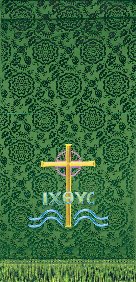 The Castle Craft Series 361/947 lectern scarf is all embroidered with fringe featuring a pole pocket for fastening the piece to furniture. Fabric at top of table will be of the same fabric as the drop portion with the exception of Normandy Brocade, Tudor Rose and Premium Tudor Rose. The standard table top fabric for these is made of white linen. Made in the USA This lectern scarf can be purchased in many different fabrics and patterns. See the fabric on the "Content" tab below to determine what material each fabric/pattern is made of. Choose the fabric/pattern from the drop down menu above to determine pricing. Comes in standard size - 20" width (left to right) x 20" depth (top front to back) x 20" drop (area hanging in front). May be ordered in custom sizes. Please call our custom sales team at 1-800-237-7511 for additional help. **This product is custom made to order and therefore non-returnable. Please allow up to eight weeks for delivery**