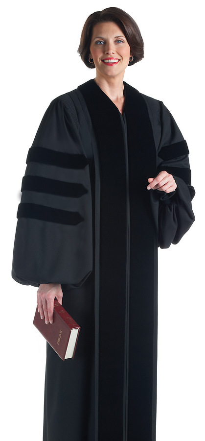 Tailored in black Wonder Crepe with black velvet panels and doctoral bars, this robe features a right full pocket, lined, bell sleeves, and top stitched pleats for smooth shape and line retention. Sizes for a floor clearance of 6" to 8".