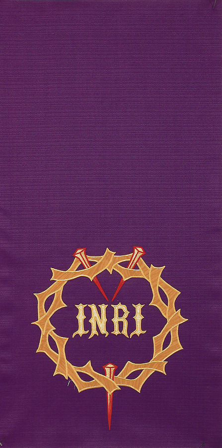 The 5001 In Remembrance of Me pulpit scarf is an applique with satin-stitch embroidery featuring a pole pocket for fastening the piece to furniture. Fabric at top of table is made of off-white linen. Made in the USA. This pulpit scarf can be purchased in many different fabrics and patterns. See the fabric guide on the "Content" tab to determine what material each fabric/pattern is made of. Choose the fabric/pattern from the drop down menu above to determine pricing. Comes in standard size - 20" width (left to right) x 20" depth (top front to back) x 20" drop (area hanging in front). May be ordered in custom sizes. Please call our custom sales team at 1-800-237-7511 for additional help. **This product is custom made to order and therefore non-returnable. Please allow up to eight weeks for delivery**