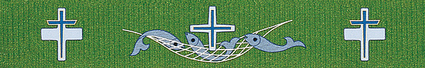 The 1001 Fishers of Men superfrontal is an applique with satin-stitch embroidery featuring a pole pocket for fastening the piece to furniture. Fabric at top of table is made of off-white linen. Made in the USA. This superfrontal can be purchased in many different fabrics and patterns. See the fabric guide on the "Content" tab to determine what material each fabric/pattern is made of. Choose the fabric/pattern from the drop down menu above to determine pricing. Comes in standard size - 84" width (left to right) x 30" depth (top front to back) x 12" drop (area hanging in front). May be ordered in custom sizes. Please call our custom sales team at 1-800-237-7511 for additional help. **This piece is custom made and is therefore non-returnable. Please allow up to eight weeks for delivery**