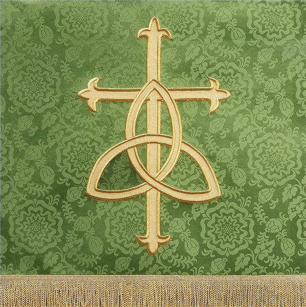 The T50 Holy, Holy, Holy pulpit scarf is an applique with satin-stitch embroidery featuring a fringe at the bottom and a pole pocket for fastening the piece to furniture. Fabric at top of table will be of the same fabric as the drop portion with the exception of Normandy Brocade, Tudor Rose and Premium Tudor Rose. The standard table top fabric for these is made of white linen. Made in the USA This pulpit scarf can be purchased in many different fabrics and patterns. See the fabric guide on the "Content" tab to determine what material each fabric/pattern is made of. Choose the fabric/pattern from the drop down menu above to determine pricing. Comes in standard size - 20" width (left to right) x 20" depth (top front to back) x 20" drop (area hanging in front). May be ordered in custom sizes. Please call our custom sales team at 1-800-237-7511 for additional help. **This product is custom made to order and therefore non-returnable. Please allow up to eight weeks for delivery**