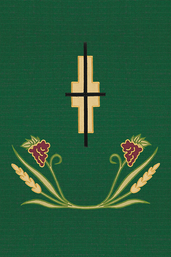 The 1169 The Harvest Banner is an applique with satin-stitch embroidery featuring tabs at the top for fastening the piece to furniture and a pole pocket at the bottom. Made in the USA This banner can be purchased in many different fabrics and patterns. See the fabric on the "Content" tab below to determine what material each fabric/pattern is made of. Choose the fabric/pattern from the drop down menu above to determine pricing. Comes in standard size - 36" width (left to right) x 54" drop (area hanging in front). May be ordered in custom sizes. Please call our custom sales team at 1-800-237-7511 for additional help. **This product is custom made to order and therefore non-returnable. Please allow up to eight weeks for delivery**