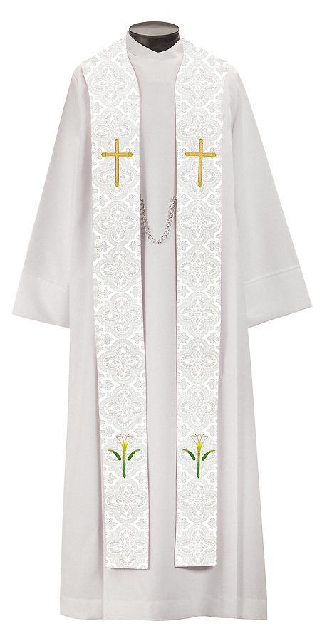 The Castle Craft Series 4200 Stole is primaily embroidered with some applique featuring a standard style with tapered neckline. Made in the USA. This Stole can be purchased in many different fabrics and patterns. See the fabric guide on the "Content" tab to determine what material each fabric/pattern is made of. Choose the fabric/pattern from the drop down menu above to determine pricing. Comes in 2 standard sizes -100" or 112" length. May be ordered in custom sizes. Please call our custom sales team at 1-800-237-7511 for additional help. **This piece is custom made and is therefore non-returnable. Please allow up to eight weeks for delivery**