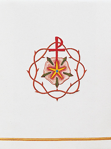 The Castle Craft Series 1169 Pulpit Scarf is all embroidered (no applique) with trim featuring a pole pocket for fastening the piece to furniture. Fabric at top of table will be of the same fabric as the drop portion with the exception of Angus Dei, Davinci Brocade, Ely, Normandy,Tudor Rose, Premium Angus Dei and Premium Tudor Rose.