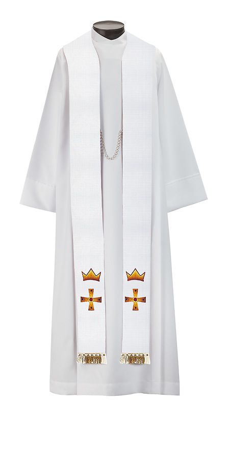 The Castle Craft Series 320 Stole is all embroidered with varigated fringe featuring a standard style with tapered neckline. Made in the USA. This stole can be purchased in many different fabrics and patterns. See the fabric guide on the "Content" tab to determine what material each fabric/pattern is made of. Choose the fabric/pattern from the drop down menu above to determine pricing. Comes in 2 standard sizes -100" or 112" length. May be ordered in custom sizes. Please call our custom sales team at 1-800-237-7511 for additional help. **This piece is custom made and is therefore non-returnable. Please allow up to eight weeks for delivery**