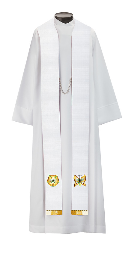 The Castle Craft Series 309 Stole is all embroidered with varigated fringe featuring a standard style with tapered neckline. Made in the USA. This stole can be purchased in many different fabrics and patterns. See the fabric guide on the "Content" tab to determine what material each fabric/pattern is made of. Choose the fabric/pattern from the drop down menu above to determine pricing. Comes in 2 standard sizes -100" or 112" length. May be ordered in custom sizes. Please call our custom sales team at 1-800-237-7511 for additional help. **This piece is custom made and is therefore non-returnable. Please allow up to eight weeks for delivery**
