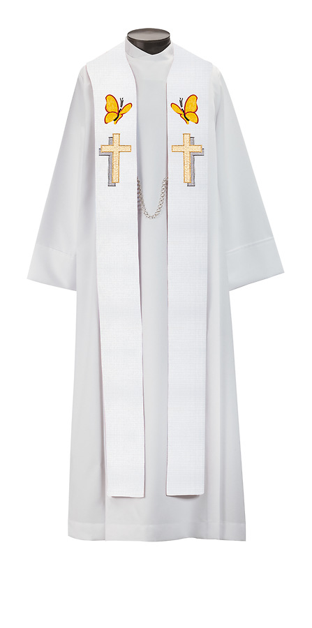 The 3399 He Lives Stole is applique with satin-stitch embroidery featuring a standard style with tapered neckline. Made in the USA. This stole can be purchased in many different fabrics and patterns. See the fabric guide on the "Content" tab to determine what material each fabric/pattern is made of. Choose the fabric/pattern from the drop down menu above to determine pricing. Comes in 2 standard sizes -100" or 112" length. May be ordered in custom sizes. Please call our custom sales team at 1-800-237-7511 for additional help. **This piece is custom made and is therefore non-returnable. Please allow up to eight weeks for delivery**