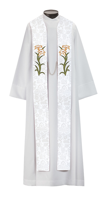 The 8118 Christ Has Risen Stole is applique with satin-stitch embroidery featuring a standard style with tapered neckline. Made in the USA. This stole can be purchased in many different fabrics and patterns. See the fabric guide on the "Content" tab to determine what material each fabric/pattern is made of. Choose the fabric/pattern from the drop down menu above to determine pricing. Comes in 2 standard sizes -100" or 112" length. May be ordered in custom sizes. Please call our custom sales team at 1-800-237-7511 for additional help. **This piece is custom made and is therefore non-returnable. Please allow up to eight weeks for delivery**
