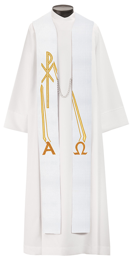 The 1849 The Great "I AM" Stole is applique with satin-stitch embroidery featuring a standard style with tapered neckline. Made in the USA. This stole can be purchased in many different fabrics and patterns. See the fabric guide on the "Content" tab to determine what material each fabric/pattern is made of. Choose the fabric/pattern from the drop down menu above to determine pricing. Comes in 2 standard sizes -100" or 112" length. May be ordered in custom sizes. Please call our custom sales team at 1-800-237-7511 for additional help. **This piece is custom made and is therefore non-returnable. Please allow up to eight weeks for delivery**