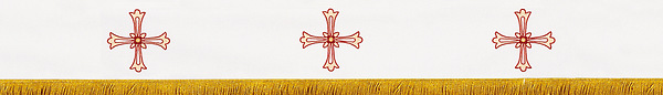 The 6610 Glorious Cross Superfrontal is an applique with satin stitch embroidery featuring fringe at the bottom and a pole pocket for fastening the piece to furniture. Fabric at top of table is made of poplin. Made in the USA. This Superfrontal can be purchased in many different fabrics and patterns. See the fabric guide on the "Content" tab to determine what material each fabric/pattern is made of. Choose the fabric/pattern from the drop down menu above to determine pricing. Comes in standard size - 84" width (left to right) x 30" depth (top front to back) x 12" drop (area hanging in front). May be ordered in custom sizes. Please call our custom sales team at 1-800-237-7511 for additional help. **This piece is custom made and is therefore non-returnable. Please allow up to eight weeks for delivery**