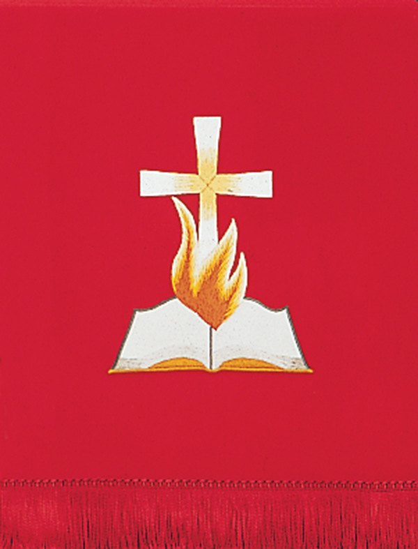 The Castle Craft Series 1307 lectern scarf is all embroidered (no applique) with fringe featuring a pole pocket for fastening the piece to furniture. Fabric at top of table will be of the same fabric as the drop portion with the exception of Davinci Brocade, Ely Brocade, Normandy Brocade, and Tudor Rose. The standard table top fabric for these is made of white linen. Made in the USA This lectern scarf can be purchased in many different fabrics and patterns. See the fabric on the "Content" tab below to determine what material each fabric/pattern is made of. Choose the fabric/pattern from the drop down menu above to determine pricing. Comes in standard size - 20" width (left to right) x 20" depth (top front to back) x 20" drop (area hanging in front). May be ordered in custom sizes. Please call our custom sales team at 1-800-237-7511 for additional help. **This product is custom made to order and therefore non-returnable. Please allow up to eight weeks for delivery**