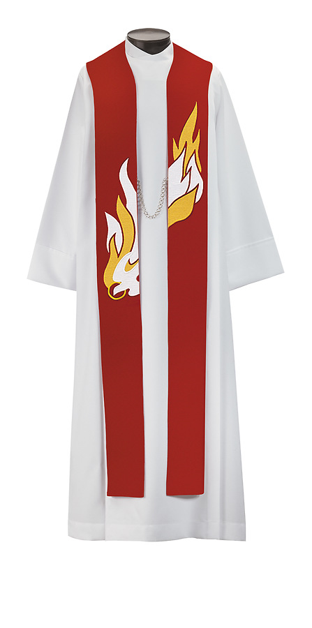 The 4224 The Holy Spirit Stole is applique with satin-stitch embroidery featuring a standard style with tapered neckline. Made in the USA. This stole can be purchased in many different fabrics and patterns. See the fabric guide on the "Content" tab to determine what material each fabric/pattern is made of. Choose the fabric/pattern from the drop down menu above to determine pricing. Comes in 2 standard sizes -100" or 112" length. May be ordered in custom sizes. Please call our custom sales team at 1-800-237-7511 for additional help. **This piece is custom made and is therefore non-returnable. Please allow up to eight weeks for delivery**