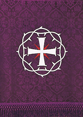 The Castle Craft Series 362/883 lectern scarf is all embroidered (no applique) with knotted fringe at the bottom featuring a pole pocket for fastening the piece to furniture. Fabric at top of table is made of off-white linen. Made in the USA. This lectern scarf can be purchased in many different fabrics and patterns. See the fabric on the "Content" tab below to determine what material each fabric/pattern is made of. Choose the fabric/pattern from the drop down menu above to determine pricing. Comes in standard size - 20" width (left to right) x 20" depth (top front to back) x 20" drop (area hanging in front). May be ordered in custom sizes. Please call our custom sales team at 1-800-237-7511 for additional help. **This product is custom made to order and therefore non-returnable. Please allow up to eight weeks for delivery**