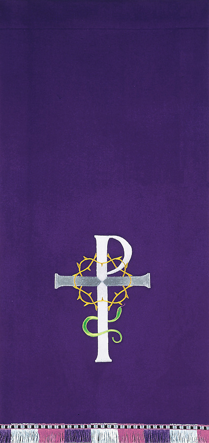 The Castle Craft Series 306/564 lectern scarf is all embroidered (no applique)with variegated fringe at the bottom featuring a pole pocket for fastening the piece to furniture. Fabric at top of table is made of off-white linen. Made in the USA. This lectern scarf can be purchased in many different fabrics and patterns. See the fabric on the "Content" tab below to determine what material each fabric/pattern is made of. Choose the fabric/pattern from the drop down menu above to determine pricing. Comes in standard size - 20" width (left to right) x 20" depth (top front to back) x 20" drop (area hanging in front). May be ordered in custom sizes. Please call our custom sales team at 1-800-237-7511 for additional help. **This product is custom made to order and therefore non-returnable. Please allow up to eight weeks for delivery**