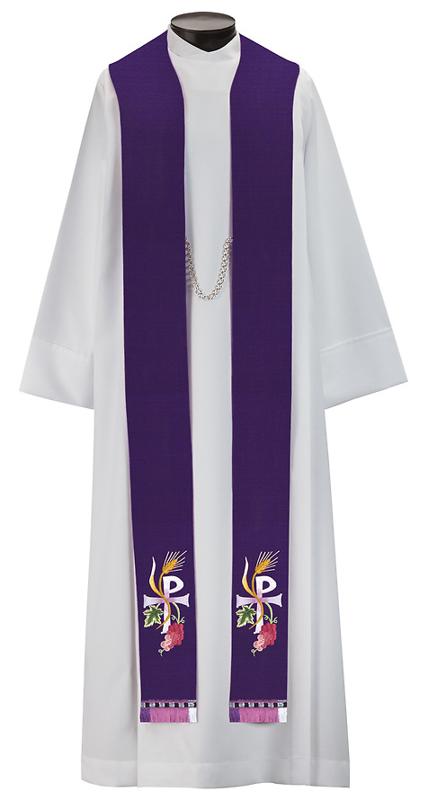 The Castle Craft 306/564 Stoleis all embroidered with varigated fringe featuring a standard style with tapered neckline. Made in the USA. This stole can be purchased in many different fabrics and patterns. See the fabric guide on the "Content" tab to determine what material each fabric/pattern is made of. Choose the fabric/pattern from the drop down menu above to determine pricing. Comes in 2 standard sizes -100" or 112" length. May be ordered in custom sizes. Please call our custom sales team at 1-800-237-7511 for additional help. **This piece is custom made and is therefore non-returnable. Please allow up to eight weeks for delivery**