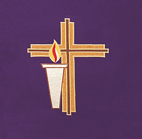 The 5412 Meditation lectern scarf is an applique with satin-stitch embroidery featuring a pole pocket for fastening the piece to furniture. Fabric at top of table is made of off-white linen. Made in the USA. This lectern scarf can be purchased in many different fabrics and patterns. See the fabric on the "Content" tab below to determine what material each fabric/pattern is made of. Choose the fabric/pattern from the drop down menu above to determine pricing. Comes in standard size - 20" width (left to right) x 20" depth (top front to back) x 20" drop (area hanging in front). May be ordered in custom sizes. Please call our custom sales team at 1-800-237-7511 for additional help. **This product is custom made to order and therefore non-returnable. Please allow up to eight weeks for delivery**