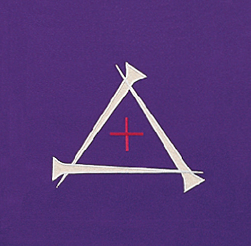 The 8410 Agony & Death of Jesus lectern scarf is an applique with satin-stitch embroidery featuring a pole pocket for fastening the piece to furniture. Fabric at top of table is made of off-white linen. Made in the USA. This lectern scarf can be purchased in many different fabrics and patterns. See the fabric on the "Content" tab below to determine what material each fabric/pattern is made of. Choose the fabric/pattern from the drop down menu above to determine pricing. Comes in standard size - 20" width (left to right) x 20" depth (top front to back) x 20" drop (area hanging in front). May be ordered in custom sizes. Please call our custom sales team at 1-800-237-7511 for additional help. **This product is custom made to order and therefore non-returnable. Please allow up to eight weeks for delivery**
