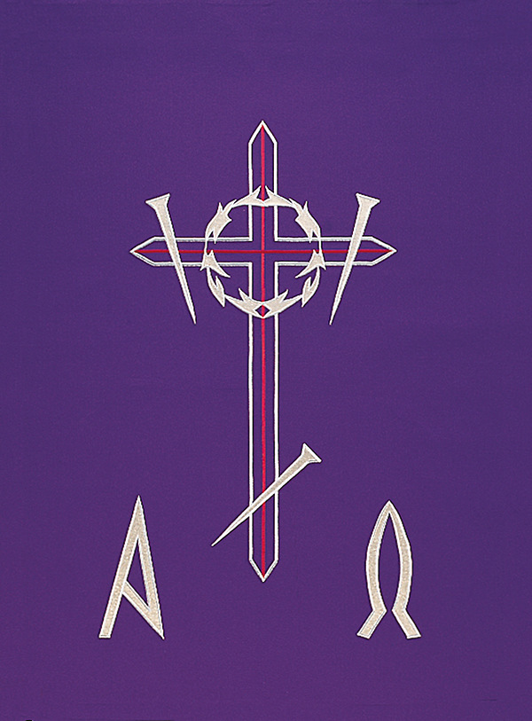 The 8410 Agony & Death of Jesus Banner is an applique with satin-stitch embroidery featuring tabs at the top for fastening the piece to furniture and a pole pocket at the bottom. Made in the USA This banner can be purchased in many different fabrics and patterns. See the fabric on the "Content" tab below to determine what material each fabric/pattern is made of. Choose the fabric/pattern from the drop down menu above to determine pricing. Comes in standard size - 36" width (left to right) x 54" drop (area hanging in front). May be ordered in custom sizes. Please call our custom sales team at 1-800-237-7511 for additional help. **This product is custom made to order and therefore non-returnable. Please allow up to eight weeks for delivery**