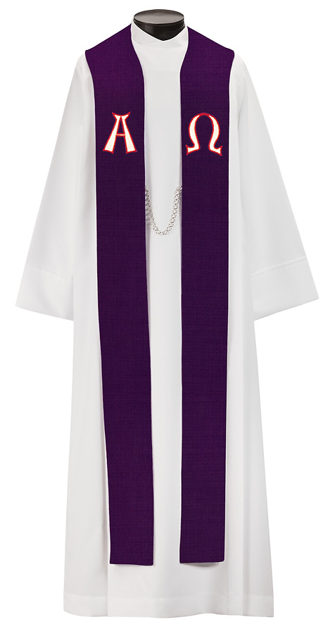 The902 Sacrifice II Stole is applique with satin-stitch embroidery featuring a standard style with tapered neckline. Made in the USA. This stole can be purchased in many different fabrics and patterns. See the fabric guide on the "Content" tab to determine what material each fabric/pattern is made of. Choose the fabric/pattern from the drop down menu above to determine pricing. Comes in 2 standard sizes -100" or 112" length. May be ordered in custom sizes. Please call our custom sales team at 1-800-237-7511 for additional help. **This piece is custom made and is therefore non-returnable. Please allow up to eight weeks for delivery**