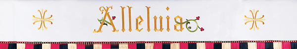 The Castle Craft 1314 Alleluia Superfrontal is all embroidered (no applique) featuring a variegated fringe at the bottom and a pole pocket for fastening the piece to furniture. Fabric at top of table is made of off-white linen. Made in the USA. This Superfrontal can be purchased in many different fabrics and patterns. See the fabric guide on the "Content" tab to determine what material each fabric/pattern is made of. Choose the fabric/pattern from the drop down menu above to determine pricing. Comes in standard size - 84" width (left to right) x 30" depth (top front to back) x 12" drop (area hanging in front). May be ordered in custom sizes. Please call our custom sales team at 1-800-237-7511 for additional help. **This piece is custom made and is therefore non-returnable. Please allow up to eight weeks for delivery**