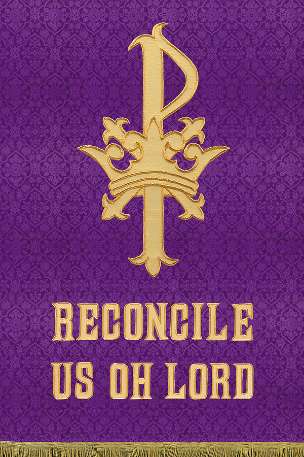 The T30 Reconcile Us Oh Lord Banner is an applique with satin-stitch embroidery and fringe featuring tabs at the top for fastening the piece to furniture and a pole pocket at the bottom. Made in the USA This Banner can be purchased in many different fabrics and patterns. See the fabric on the "Content" tab below to determine what material each fabric/pattern is made of. Choose the fabric/pattern from the drop down menu above to determine pricing. Comes in standard size - 36" width (left to right) x 54" drop (area hanging in front). May be ordered in custom sizes. Please call our custom sales team at 1-800-237-7511 for additional help. **This product is custom made to order and therefore non-returnable. Please allow up to eight weeks for delivery**