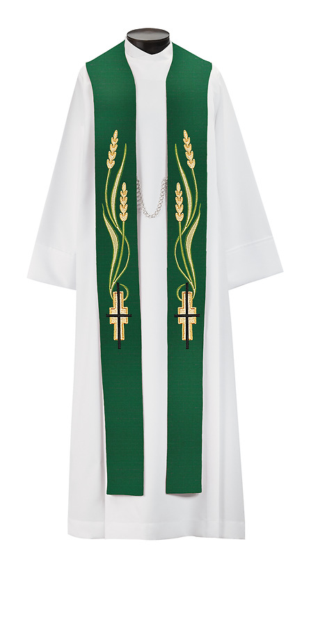 The 1169 The Harvest Stole is an applique with satin-stitch embroidery featuring a standard style with tapered neckline. Made in the USA. This stole can be purchased in many different fabrics and patterns. See the fabric guide on the "Content" tab to determine what material each fabric/pattern is made of. Choose the fabric/pattern from the drop down menu above to determine pricing. Comes in 2 standard sizes -100" or 112" length. May be ordered in custom sizes. Please call our custom sales team at 1-800-237-7511 for additional help. **This piece is custom made and is therefore non-returnable. Please allow up to eight weeks for delivery**