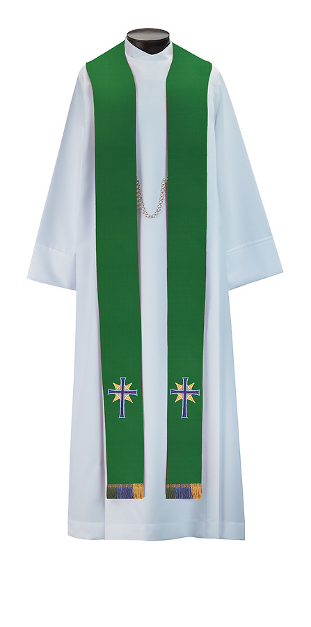 The Castle Craft 1359 Stole is an applique with satin-stitch embroidery with fringe featuring a standard style with tapered neckline. Made in the USA. This stole can be purchased in many different fabrics and patterns. See the fabric guide on the "Content" tab to determine what material each fabric/pattern is made of. Choose the fabric/pattern from the drop down menu above to determine pricing. Comes in 2 standard sizes -100" or 112" length. May be ordered in custom sizes. Please call our custom sales team at 1-800-237-7511 for additional help. **This piece is custom made and is therefore non-returnable. Please allow up to eight weeks for delivery**
