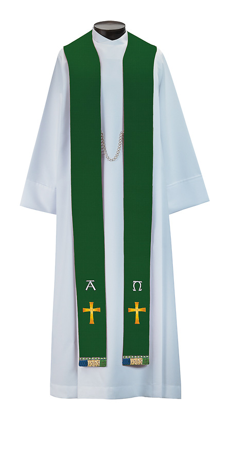The Castle Craft 1308 Stole is all embroidered with variegated fringe featuring a standard style with tapered neckline. Made in the USA. This stole can be purchased in many different fabrics and patterns. See the fabric guide on the "Content" tab to determine what material each fabric/pattern is made of. Choose the fabric/pattern from the drop down menu above to determine pricing. Comes in 2 standard sizes -100" or 112" length. May be ordered in custom sizes. Please call our custom sales team at 1-800-237-7511 for additional help. **This piece is custom made and is therefore non-returnable. Please allow up to eight weeks for delivery**