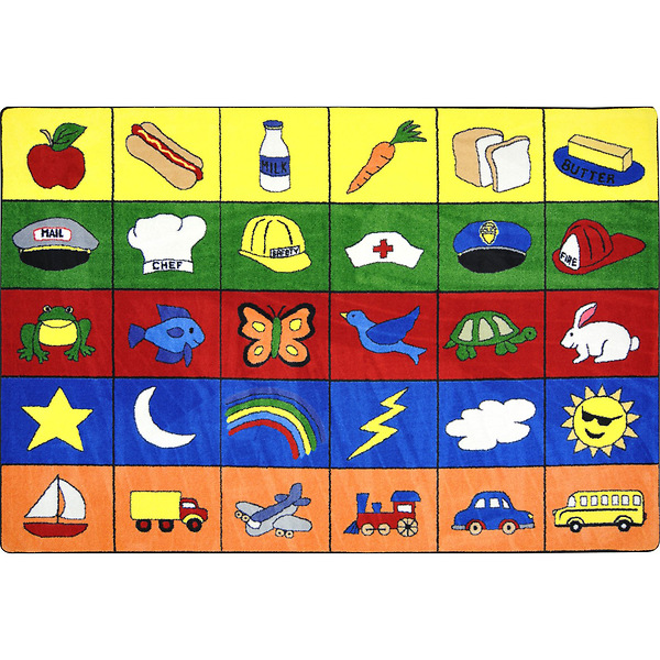 Teach your children about healthy eating, community helpers, nature friends, weather, and transportation with the fun cartoon images on this captivating organizational carpet.