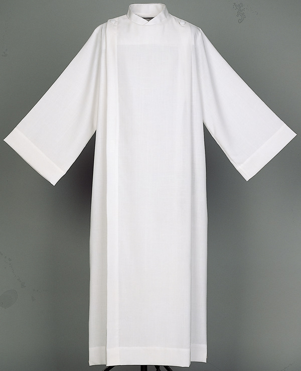 This alb is made of a 65% polyester/35% cotton blend and features a button closure. Also available with a Velcro closure (see SP219085). Made in the USA.