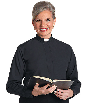 Enjoy the look and comfort of this long sleeved clergy shirt in either black or white from Murphy, tailored in machine washable poly/cotton. Features a tailored collar with removable collar tab and concealed front button closure.