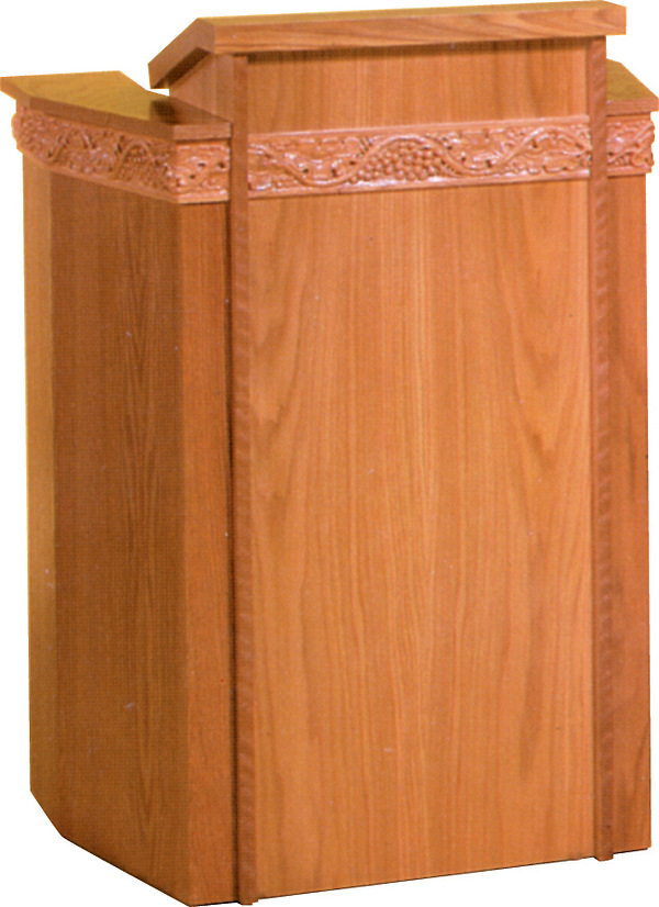 Beautiful medium sized pulpit with warp around banding of grapes and vine carvings with extended shelf for lamp and microphone and two inside shelves. Made in the USA of northern red oak and available in 16 different finishes and coated in a water resistant lacquer.