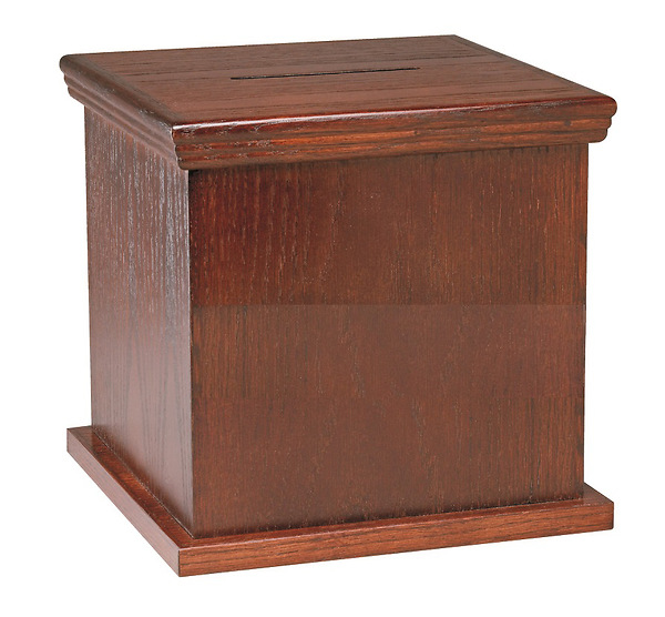 Provide your church members and guests a secure way to submit their financial gift with this tithe/offering box. Features a locking door on the back side. Made in the USA of northern red oak and available in 16 different finishes and coated in a water resistant lacquer.