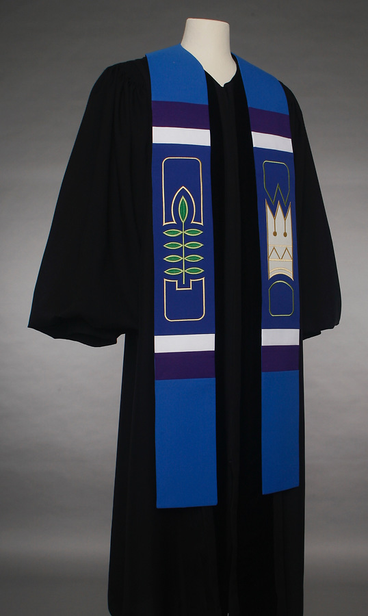 This beautiful stole in blue with design of Palm Leaf and Crown features vibrant colors and intricate detailing with a unique combination of embroidery and appliqués. Liberty fabric is treated for soil resistance and color-fastness for years of service. Made in the USA. Choose 100” or 110" lengths.