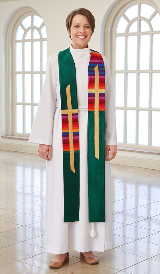 This stole from WomenSpirit is made of imported fair trade Guatemalan cotton in rainbow hues along with a silk dupioni base fabric. Curved at the neck for a better stay put fit. Colors available: Green, Red, White, Blue, and Purple. Dry clean only.