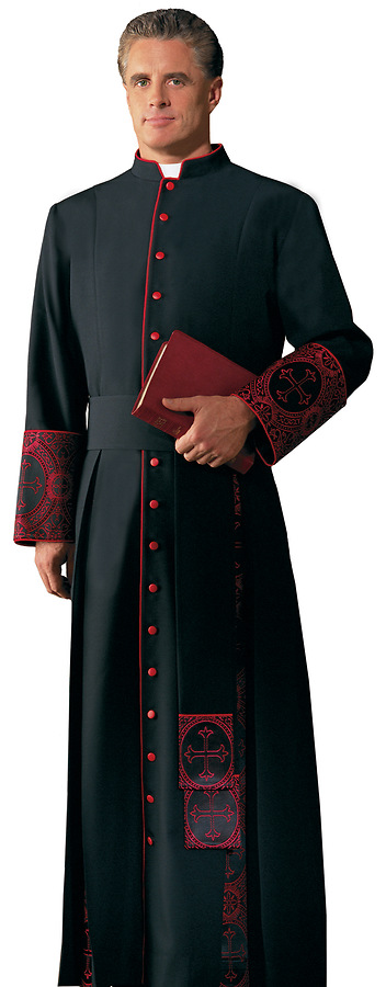 Black Viva edged with scarlet piping, featuring black-red Eminence Brocade on the deep cuffs and front and back pleat inserts. Slightly tapered cut, lined to the waist, with inner vest pocket, right pocket slit, and full left pocket. Includes removable collar tab. Sized for a floor clearance of 4" to 6".